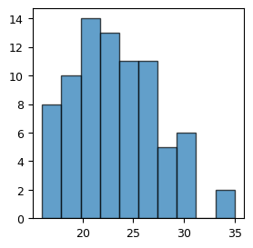 plt.hist(age, rwidth=h, edgecolor='black', alpha=0.7)'''Prompt