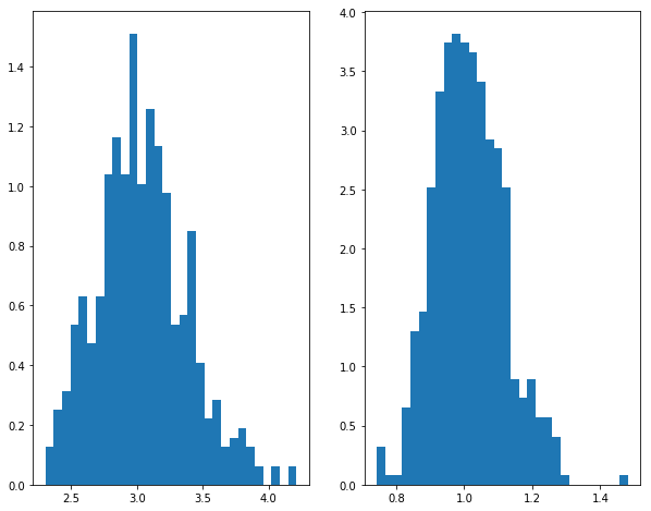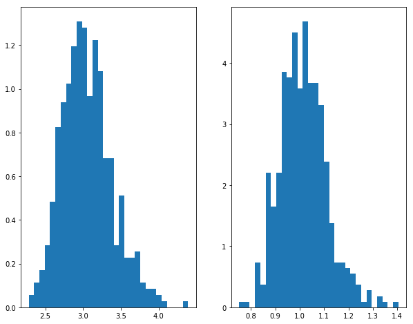ax2.hist(RESULT[:,1 ],bins= 30 ,normed= 1 )