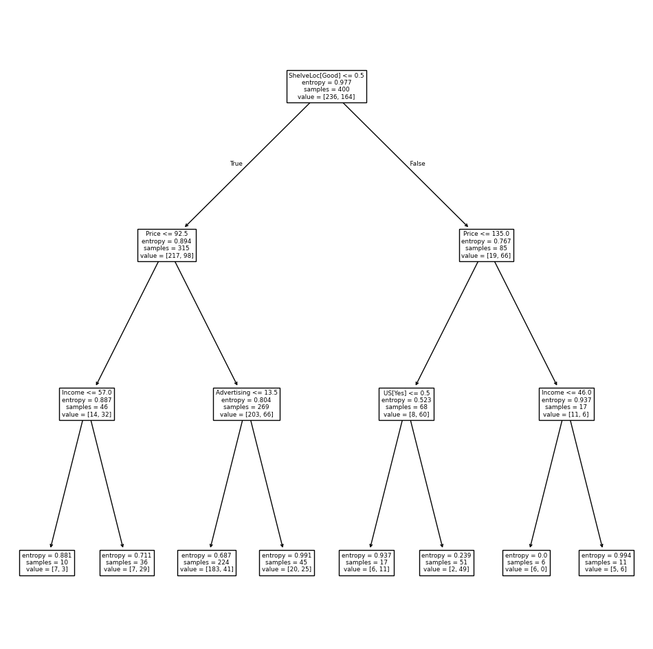 "No")We now use DecisionTreeClassifier() to fit a classification tree in order to predict High using all variables but Sales. To do so, we must form a model matrix as we did when fitting regression models.