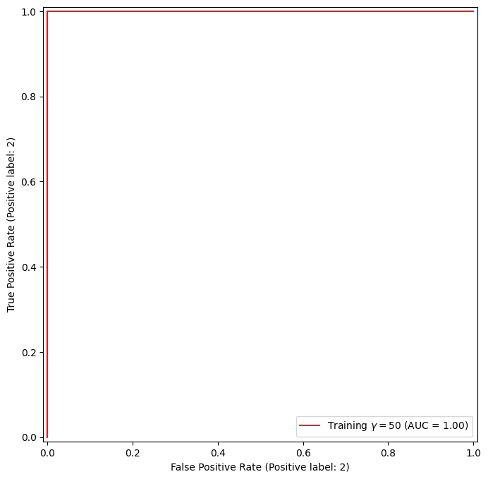 However, these ROC curves are all on the training data. We are really more interested in the level of prediction accuracy on the test data. When we compute the ROC curves on the test data, the model with \(\gamma=0.5\) appears to provide the most accurate results.