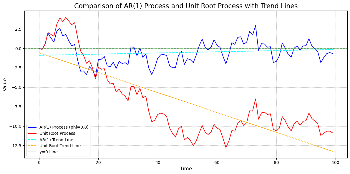 plt.title("Comparison of AR(1) Process and Unit Root Process with Trend Lines", fontsize=16)