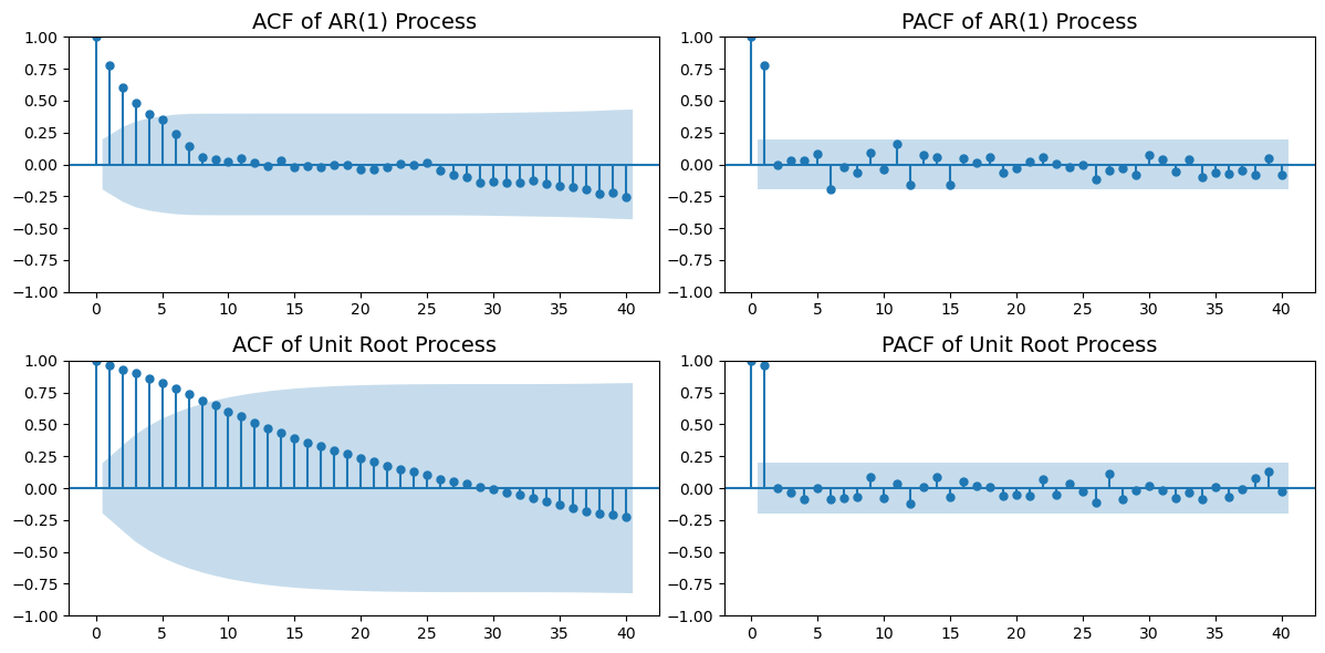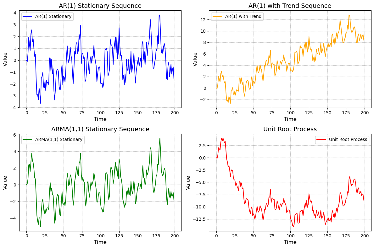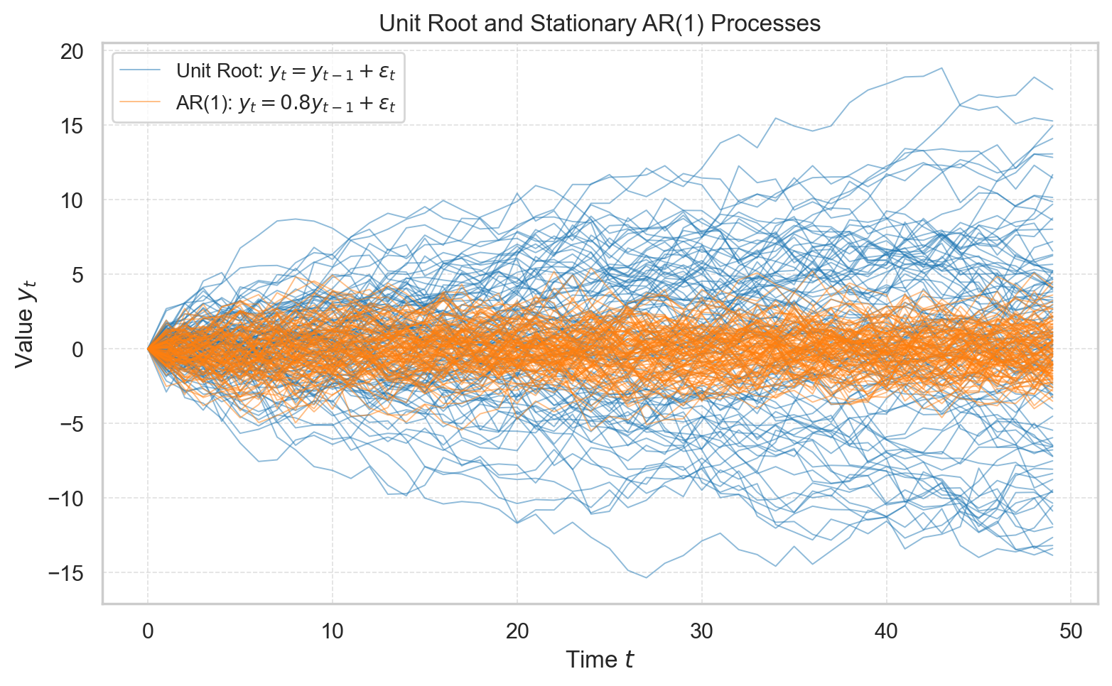 AR 过程和单位根过程的主要区别在于平稳性。AR 过程是平稳的,而单位根过程是非平稳的。平稳性意味着序列的统计特性在时间上保持不变,而非平稳性则意味着序列的统计特性随时间变化而变化。