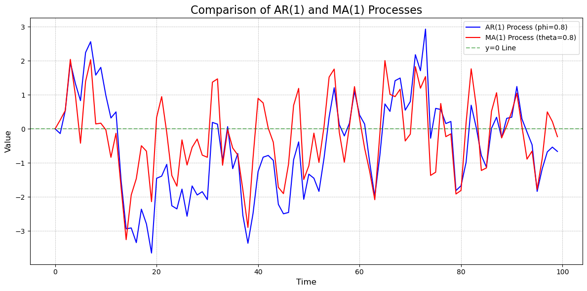 因此,\(AR(1)\) 模型可以看作是一个具有指数衰减特性的模型。也就是说,当前值 \(X_t\) 主要受到最近的随机扰动项 \(\epsilon_{t-1}\) 的影响,而对更早的随机扰动项的影响则逐渐减弱。这种特性使得 \(AR(1)\) 模型在建模时间序列数据时非常实用,因为它能够有效地捕捉到数据的自相关性和记忆效应。