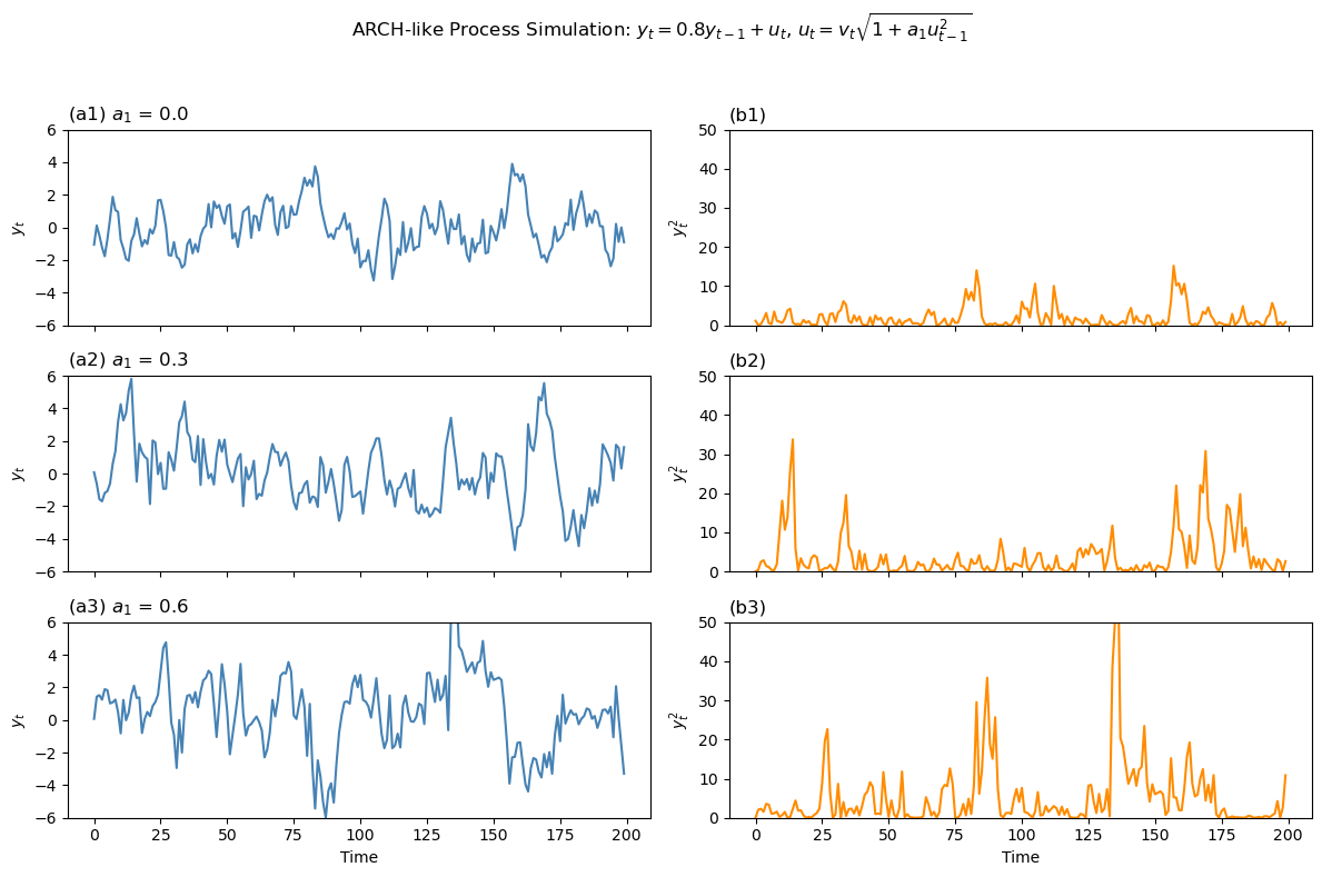 因此,\(y_t\) 的条件方差同样是 \(u_{t-1}^2\) 的函数。换言之,ARCH 会直接影响干扰项 \(u_t\) ,而被解释变量 \(y_t\) 虽然是由线性模型产生,但由于其干扰项中包含了 ARCH 效应,所以 \(y_t\) 本身也是一个 ARCH 过程。