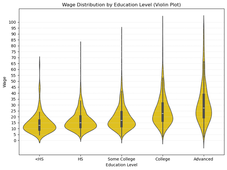 - 探索性数据分析:采用散点图、箱线图、小提琴图等可视化工具,分析工资在不同子样本 (不同教育水平、不同地区、不同性别等) 下的分布情况,以便初步了解工资与各个特征之间的关系;