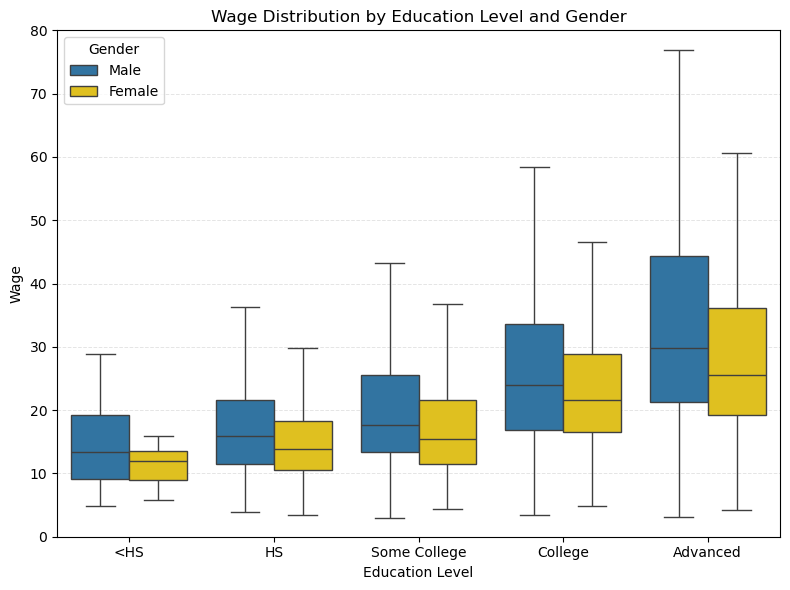 - 在其他工作相关特征 \(X\) 相同的情况下,男性和女性工人的预测工资有何不同?