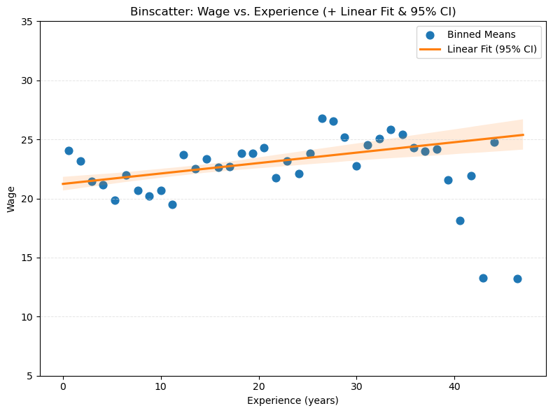 - 采用分仓散点图和回归线,分析工资与潜在工作经验之间的关系。